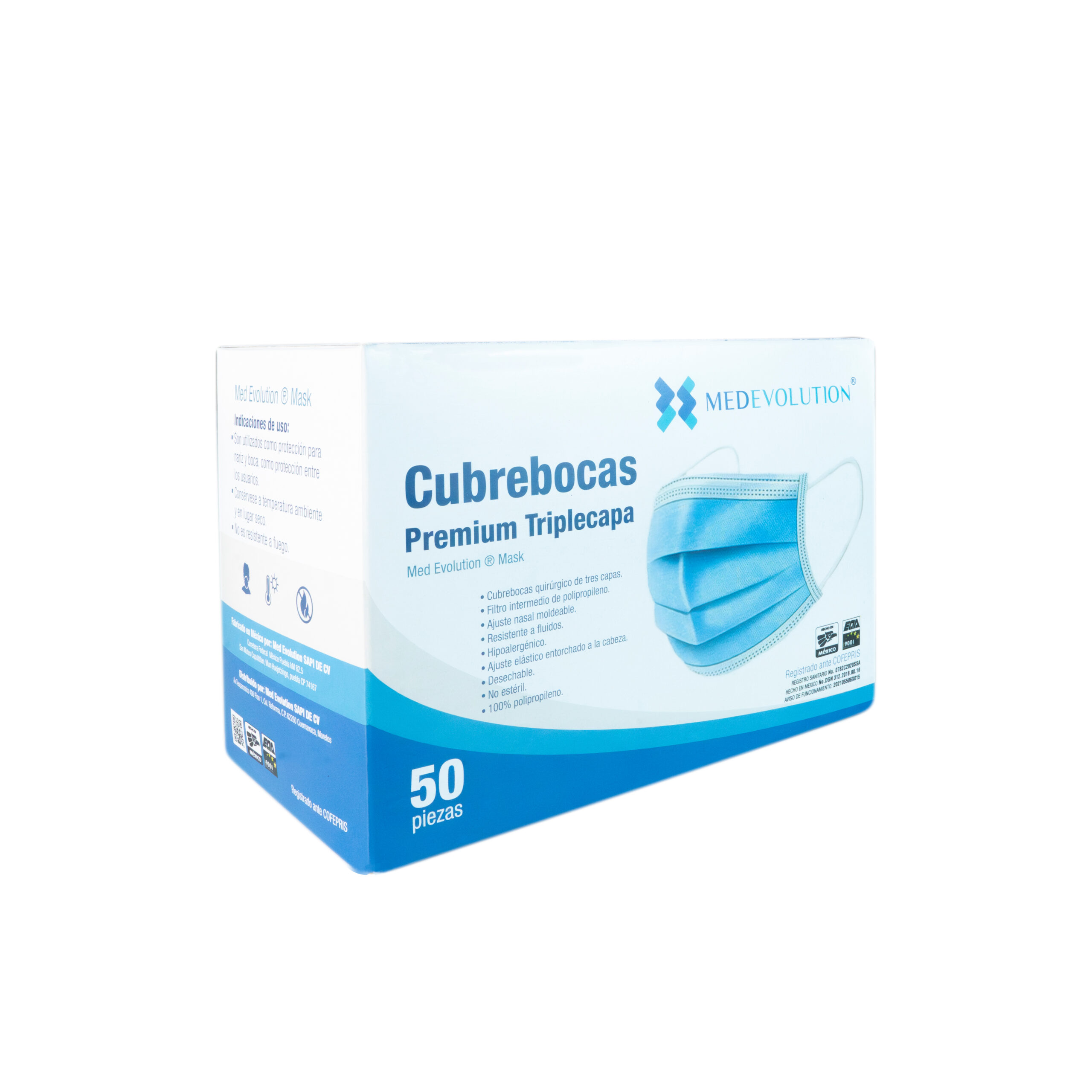 Protección confiable y cómoda con tres capas de filtrado, ideal para uso médico y personal. Presentación de 50 piezas.