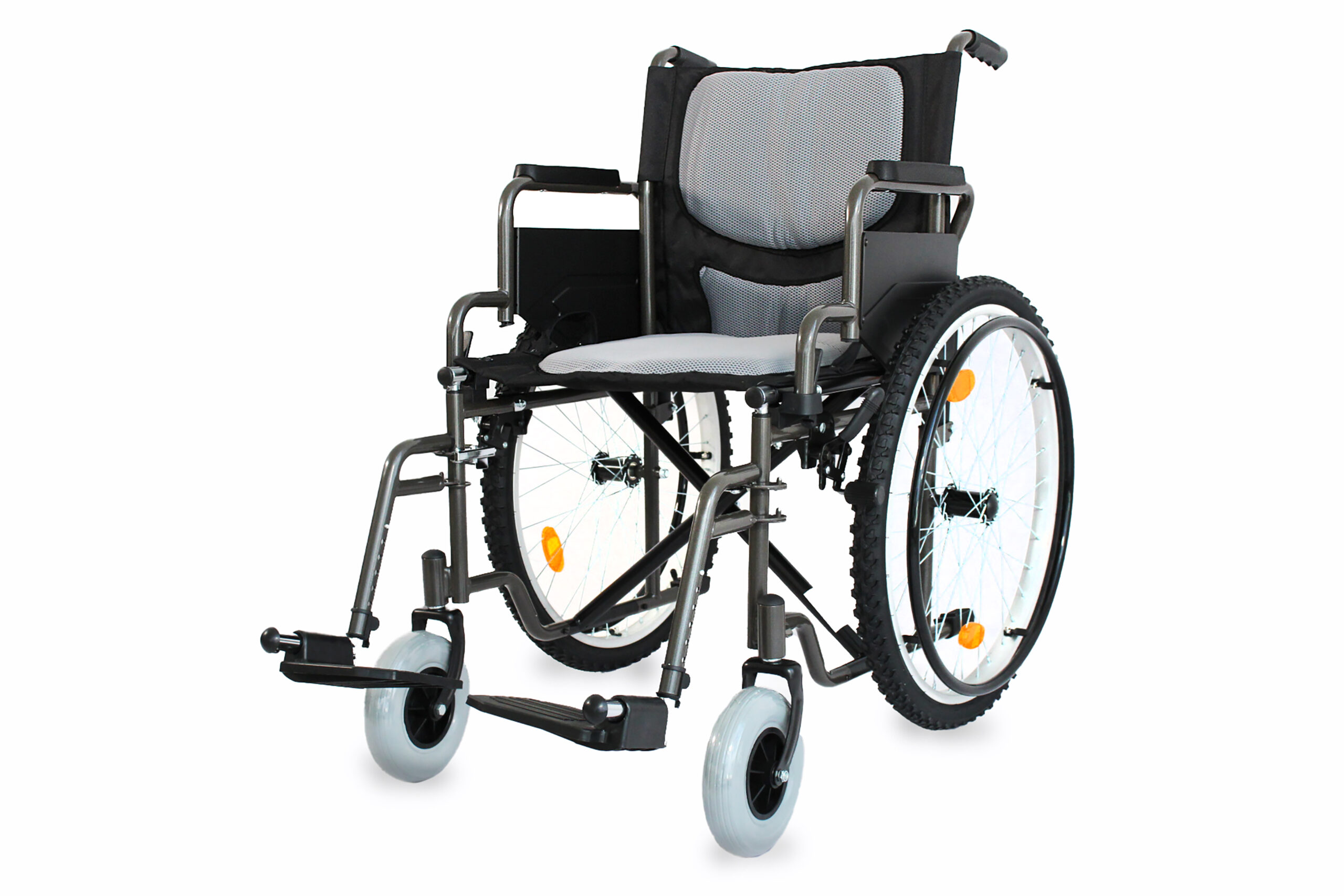 Movilidad confiable para clínica u hogar. Chasis resistente, frenos manuales y reposapiés abatibles/desmontables. Versiones estándar, ligera y todo terreno; opciones con llanta sólida o neumática.